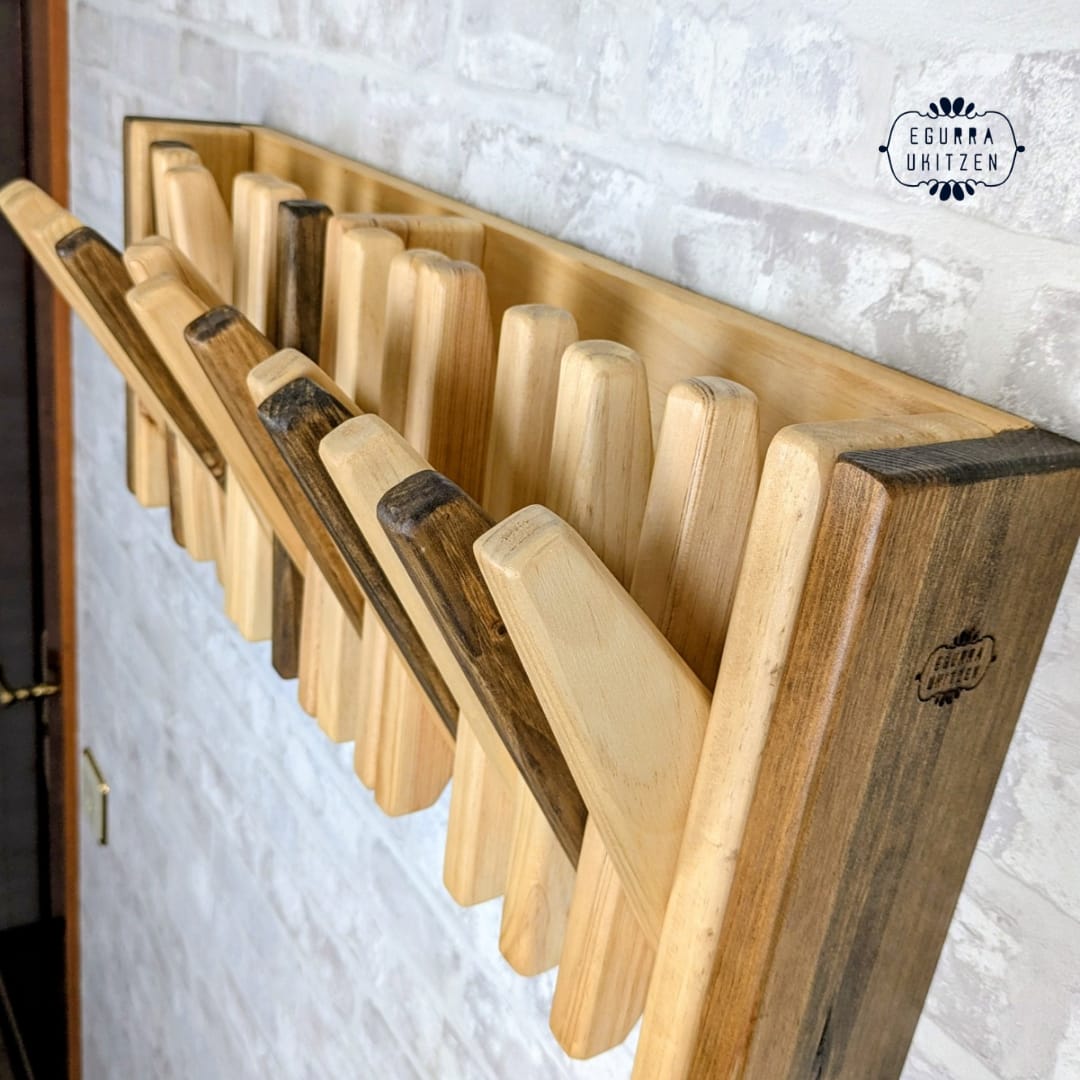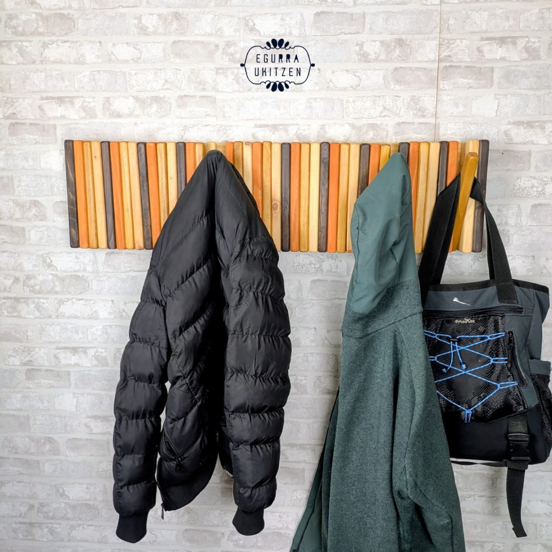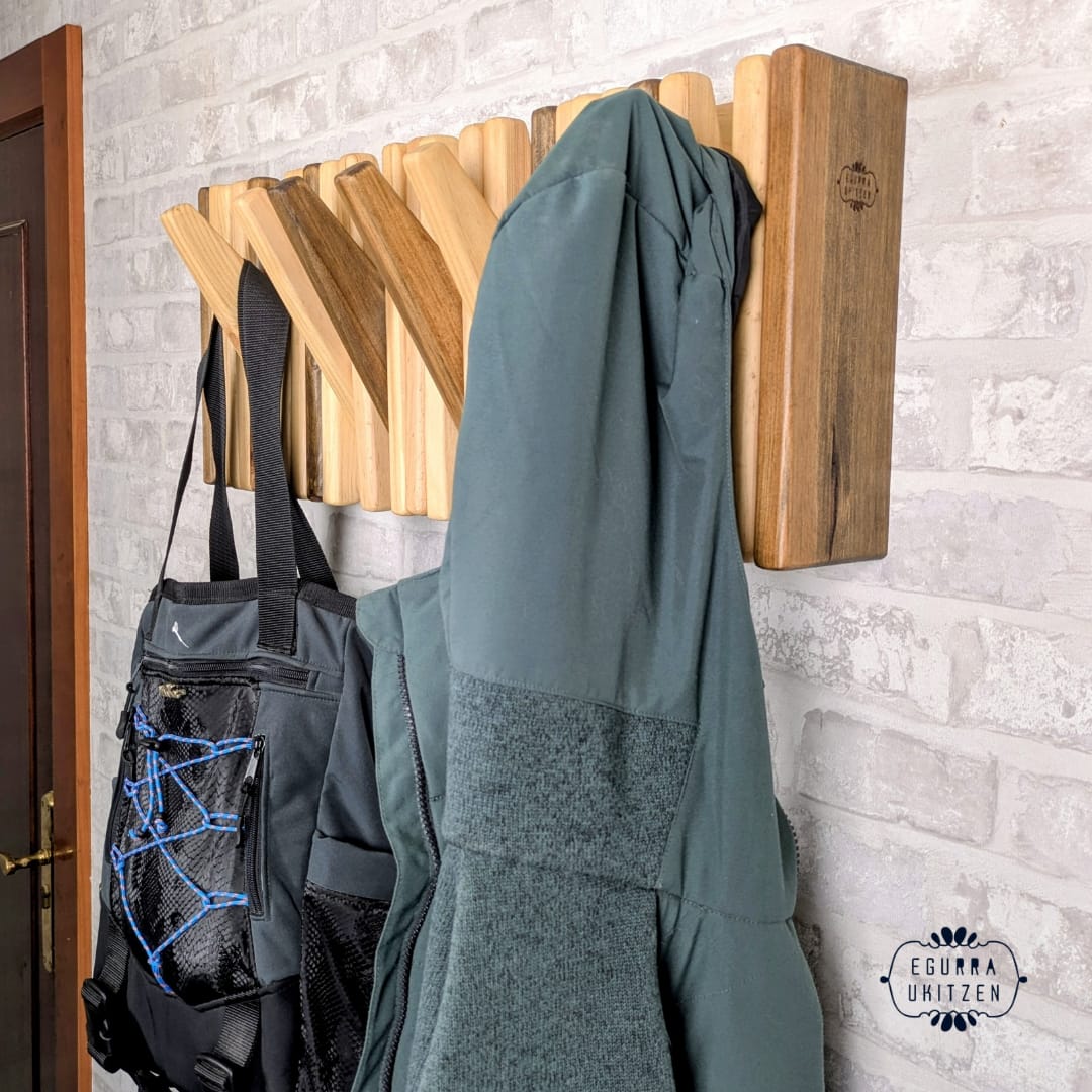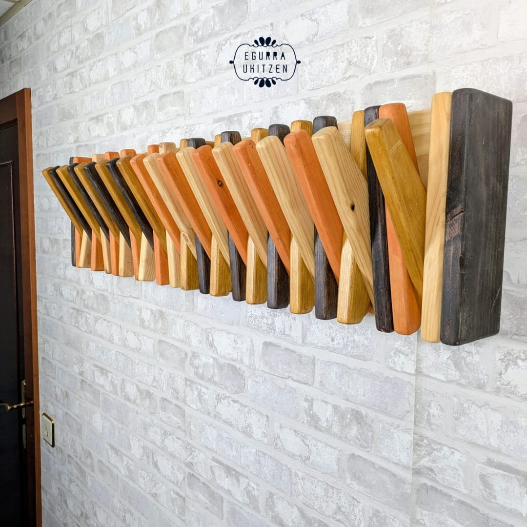 Se realiza totalmente a medida, adaptándose al espacio disponible y al número de colgadores necesarios. Además, puedes elegir el color o acabado que mejor encaje con tu estilo: natural, tonos claros, envejecidos o más oscuros, siempre respetando la belleza de la madera.