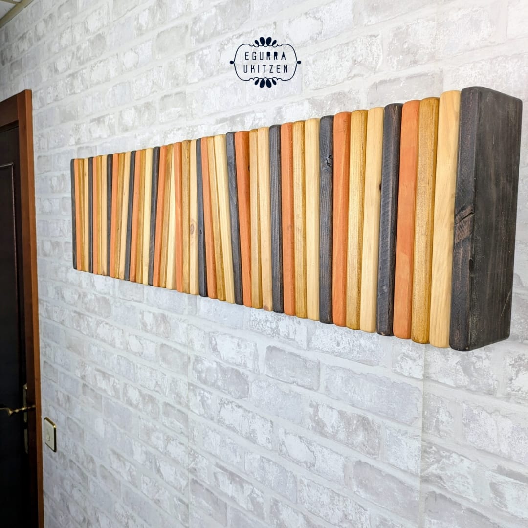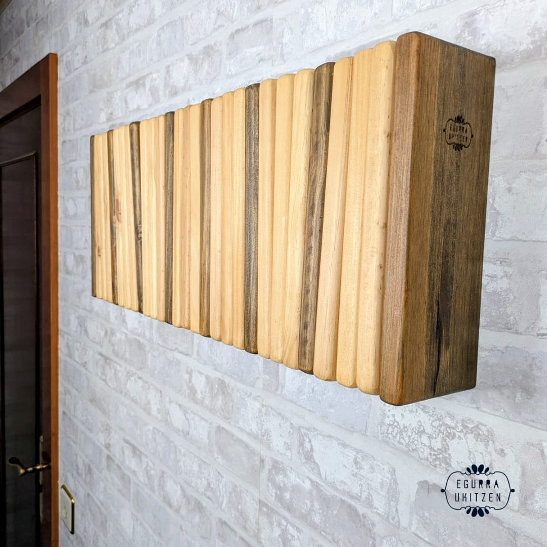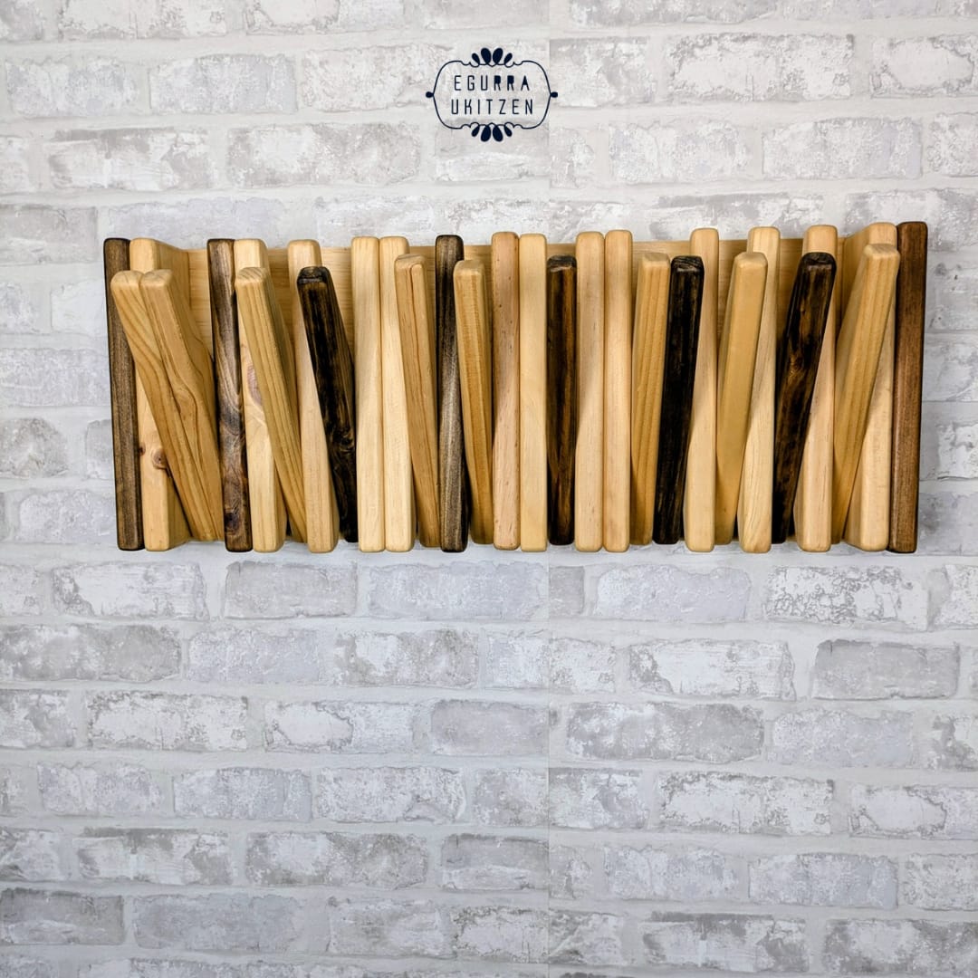 Se realiza totalmente a medida, adaptándose al espacio disponible y al número de colgadores necesarios. Además, puedes elegir el color o acabado que mejor encaje con tu estilo: natural, tonos claros, envejecidos o más oscuros, siempre respetando la belleza de la madera.