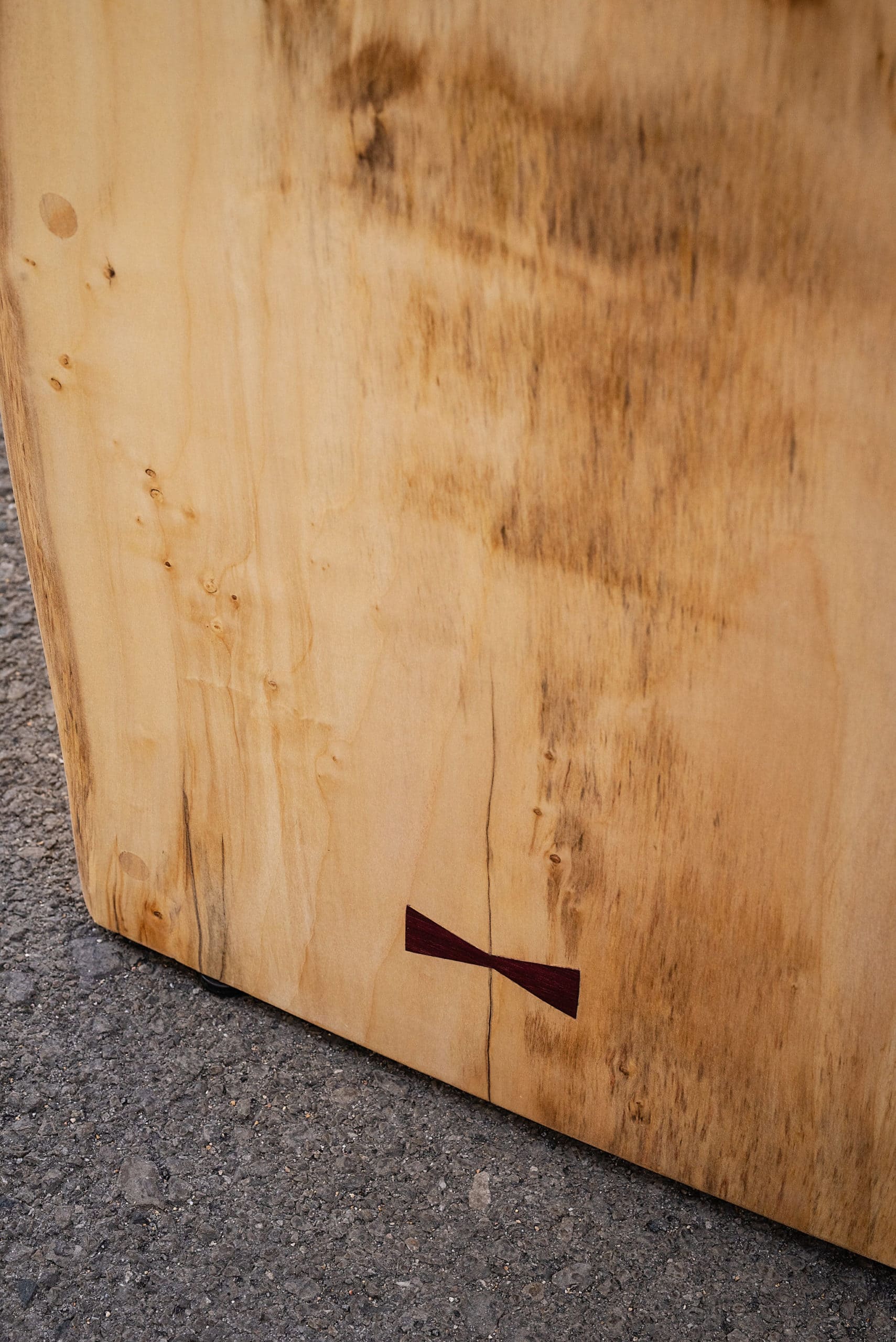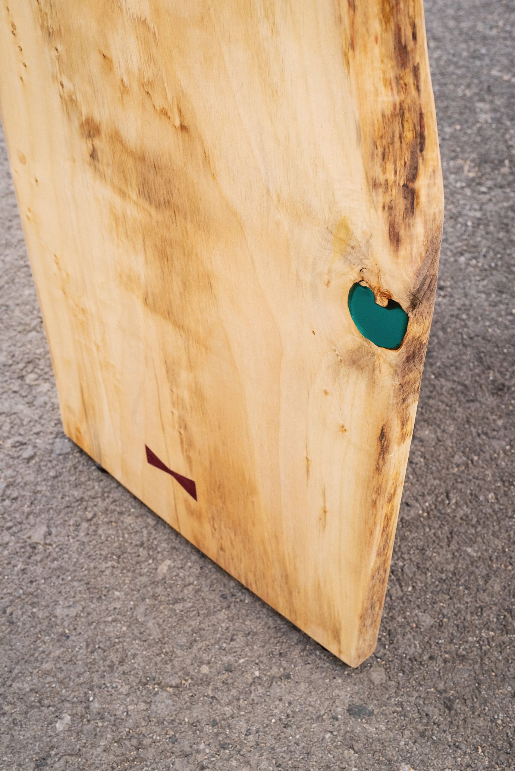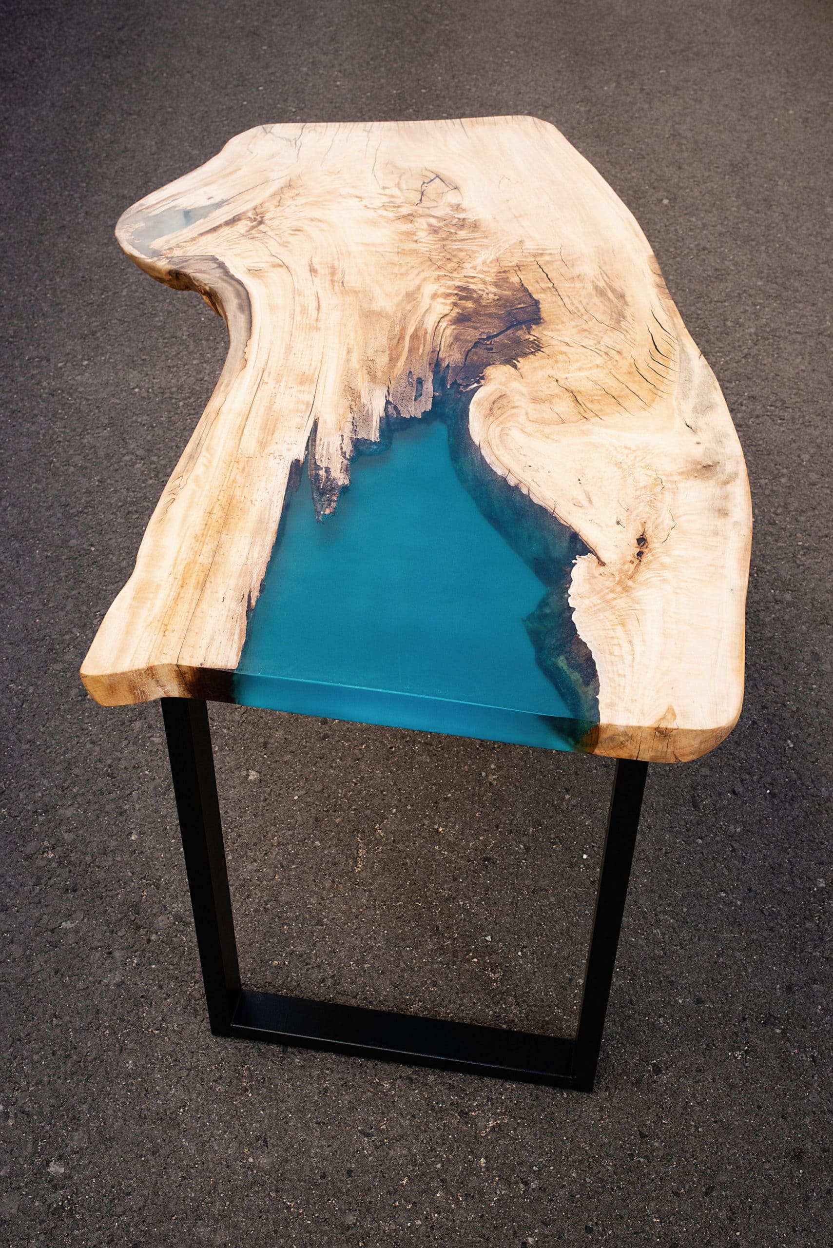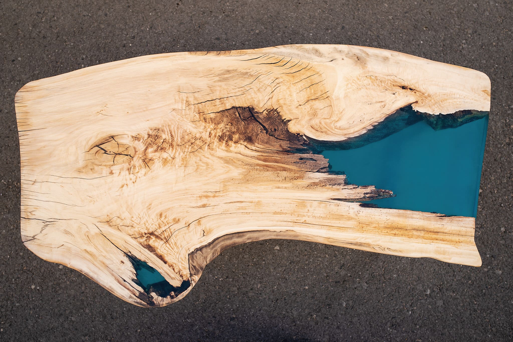 Buscando estas sensaciones e inspirándonos en el río Urederra y su agua turquesa, hemos creado este escritorio fabricado con madera de Álamo Blanco (habitual en las orillas de este río) y resina incrustada, añadiendo tinte translucido de este color tan especial.