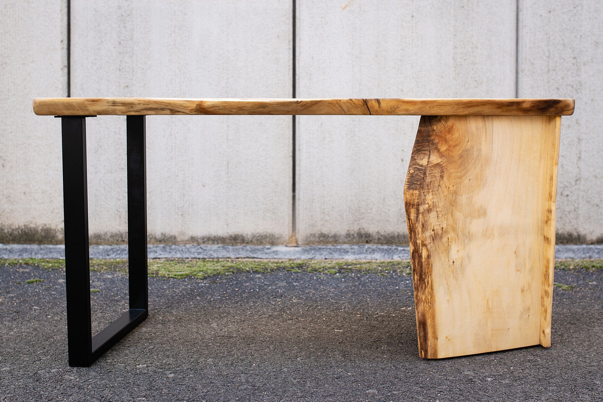 Una de sus patas es metálica, fabricada a medida, para la otra hemos utilizado la misma madera que la encimera, convirtiéndola así en una pieza única.